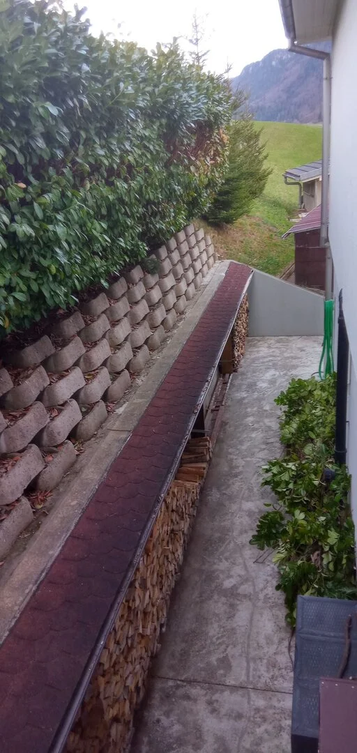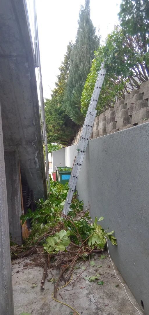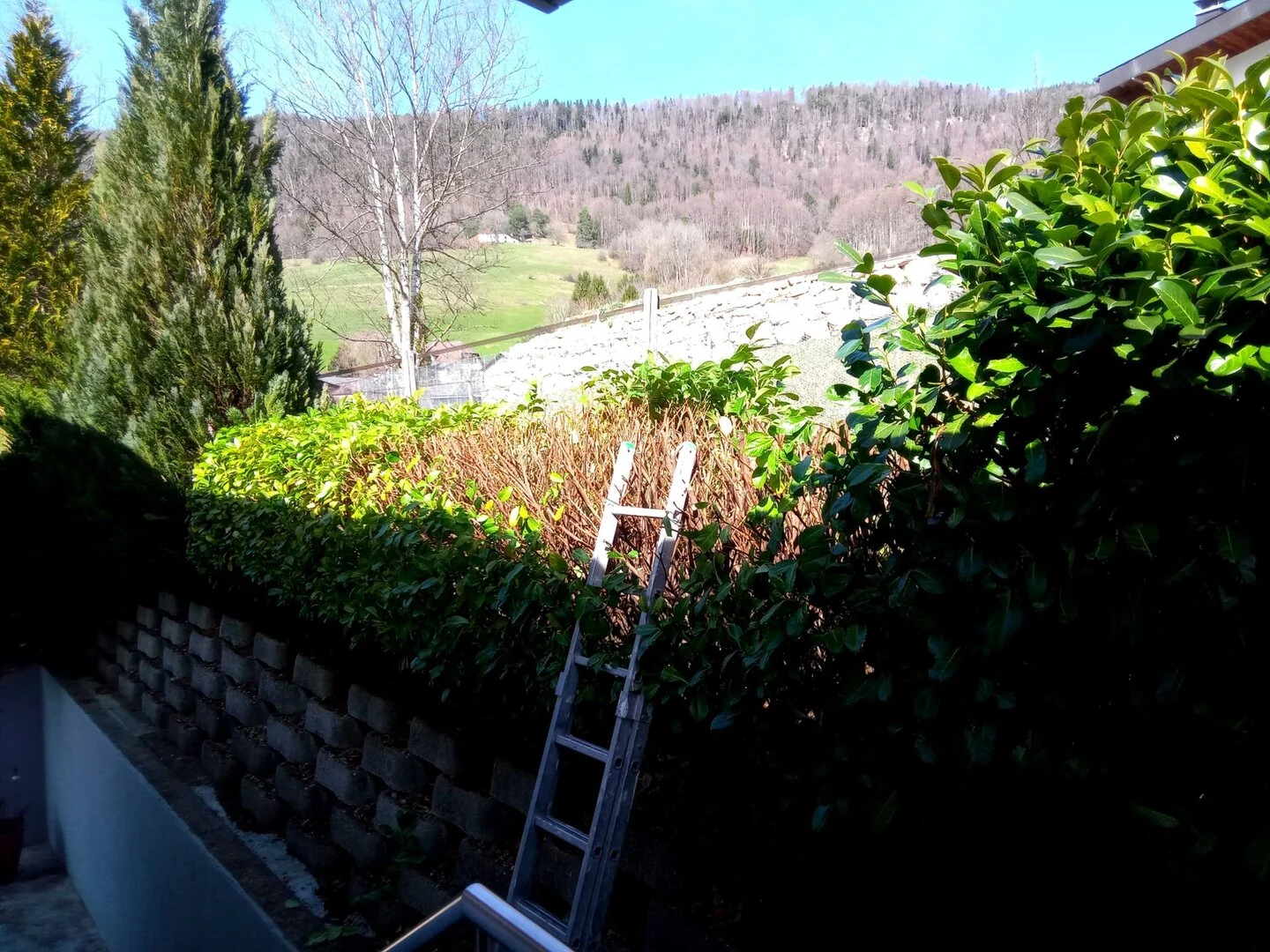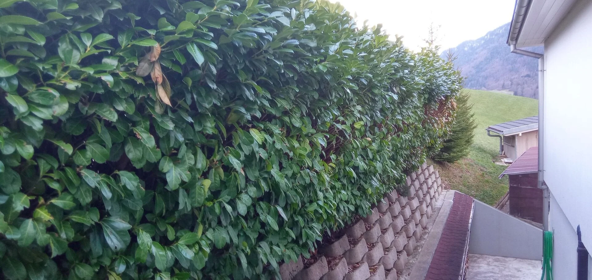 La volume de la haie "Lauriers Cerises" situé sur le mur au nord de la maison a été considérablement réduit. (taille sévère).